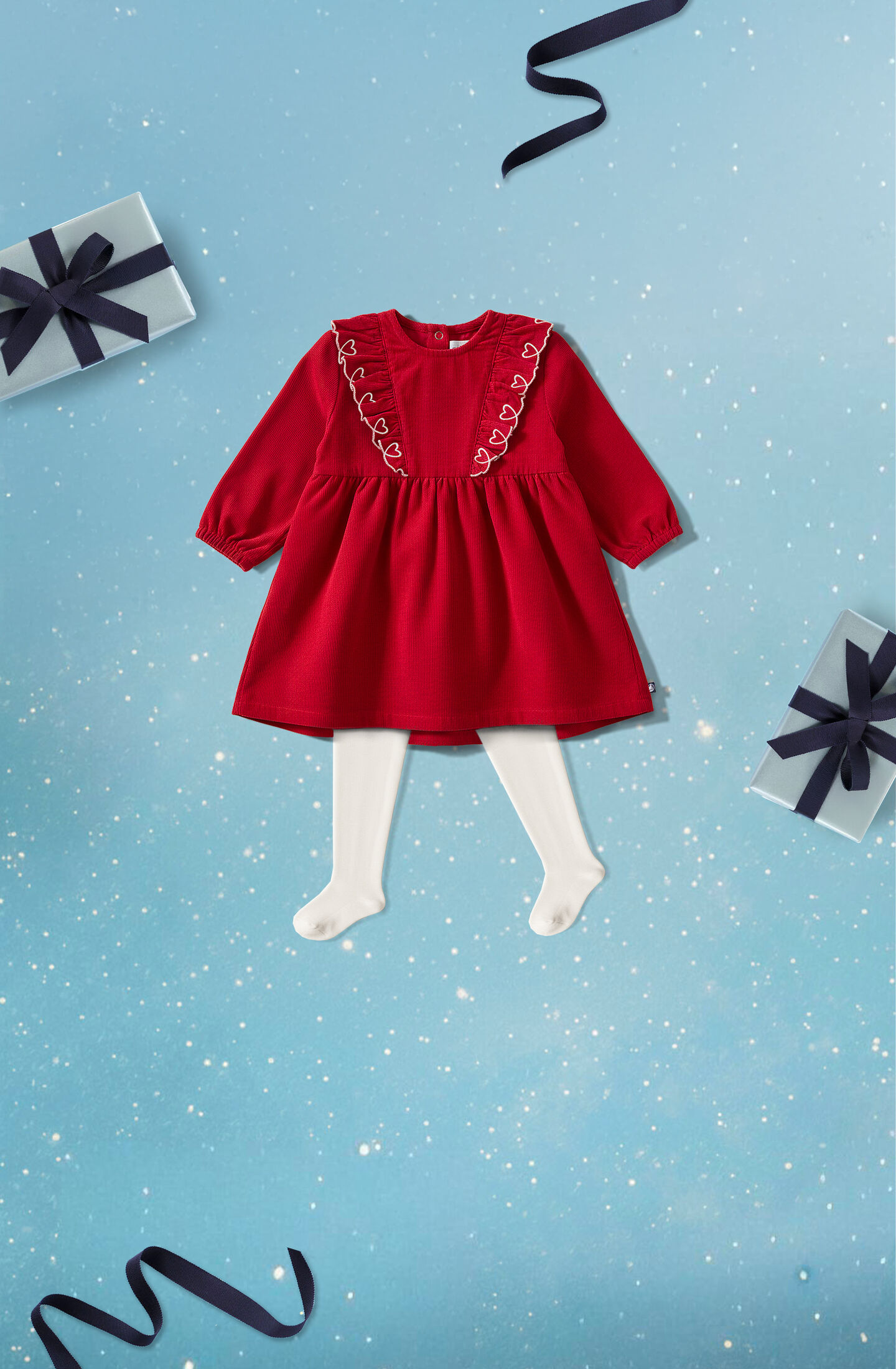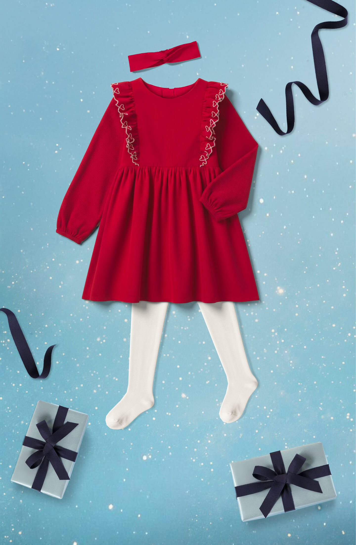In unseren Kleidern freuen sich die Mädchen auf eine Weihnachtsreise voll Zauber und Gemütlichkeit. Egal, ob in glänzend rotem Samt mit gestickten Herzen auf Rüschen oder im rot-weißen Streifenshirt mit glitzerndem Unterrock: So navigieren sie durch die Weihnachtszeit!